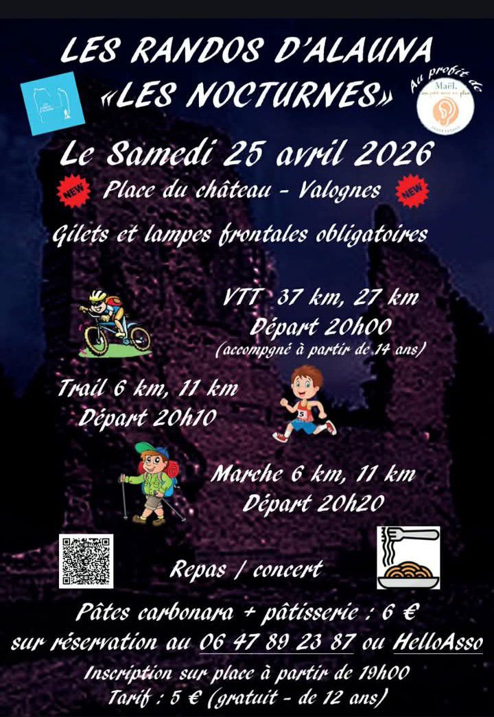 - Marche : 14 km (d+ 87m) : 9h, 12 km (d+ 71m) : 9h10, 9 km (d+ 59m) : 9h50 et 5 km (d+ 17m) : 10h20